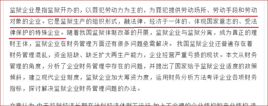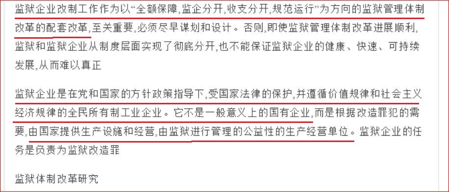 中共的监狱企业是受中共党中央和国务院的统一管理、受中共法律保护的全民所有制工业企业,中共根据所谓“改造罪犯”的需要由国家提供生产设施和经营。中共的监狱企业原本实行的是“监企合一”的体制, 2003年中共司法部向全国的监狱系统发出《国务院批转司法部关于监狱体制改革试点工作指导意见的通知》(国函[2003]15号)[7],要求实行“监企分开”,“组建新的监狱国有独资公司及子公司或分公司”,“监狱局、监狱及监狱企业按照精简、高效、统一的原则设置内设机构”。过程中所需的各项改造经费由国家财政“全额保障”。
